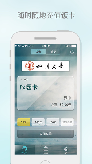 1.在这里,你可以随时随地充值饭卡,饭卡掉了还可以立即挂失。2.在这里,你可以轻松缴纳学费、考试费、培训费等各种费用