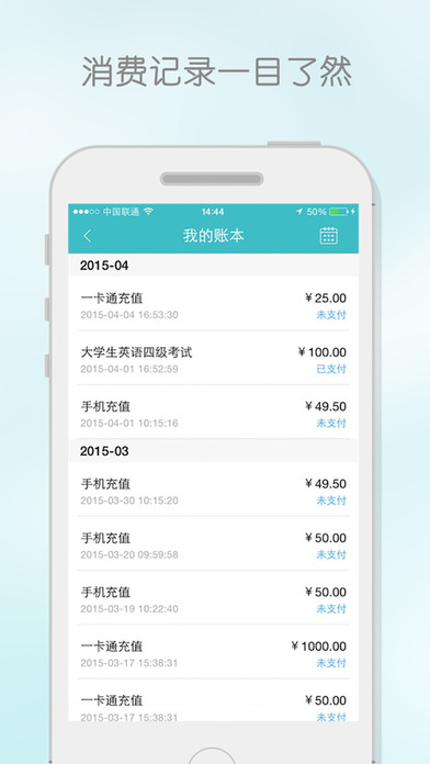 3.在这里,你可以查询到饭卡的所有消费记录,每月的校内消费分布都一目了然,粑粑麻麻再责怪你乱花钱的时候,果断晒出你的消费记录吧~