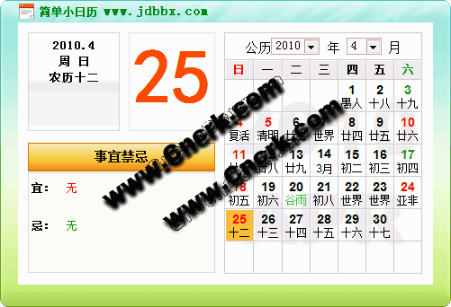 本日历日期准确,外加事宜禁忌、节日、农历显示等功能,小巧而强大