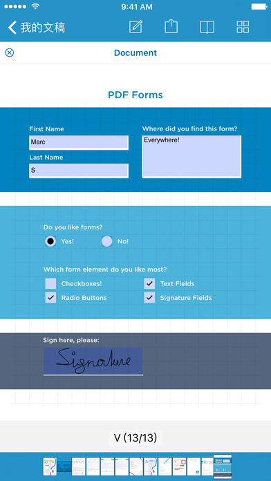 PDFViewerapp在任意位置签署文稿,只需要使用手指或ApplePencil将您的签名添加到任何文稿,PDFViewerapp会根据需要移动并调整签名大小,PDFViewerapp还可以平展文稿以确保签名不会发生更改。