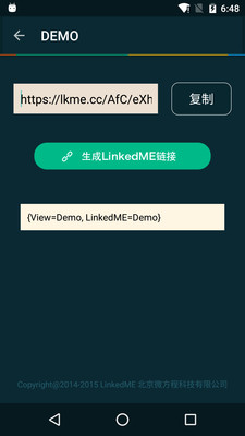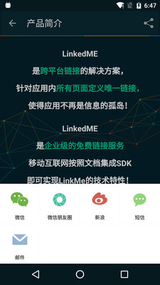 LinkedME主要研发两款产品,LinkPage和LinkSense。LinkPage产品主要是APP自身深度链接功能,实现从任意取到(微信、微博、短信、邮件、广告平台、百度搜索等等)“一键跳转”到APP内的具体相应页面,并检测各个渠道的转化效果,帮助移动企业运营人员优化运营方案,提供APP的活跃度和留存率。