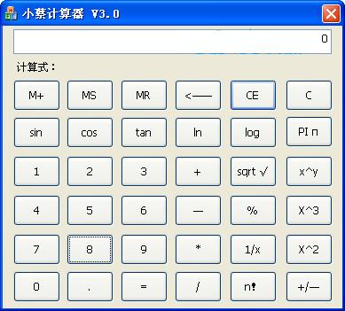 小蔡计算器是一款多功能计算器,具有windows计算器的全部功能,除此之外还有计算式显示功能,方便大家使用,采用vs2008基于MFC开发,软件体积小巧却非常实用,是日常学习和使用的好帮手,好软件!