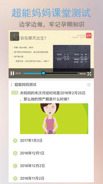 【视频课堂】丰富的在线课堂,通过专业医生的视频讲演、真实操作、模拟宝宝等方式最直观地向孕妇演示讲解怀孕期间的相关事项。【今日知识】宝宝每一天地成长清晰可见;根据你设置的预产期,为你推送最贴心、最优质孕期知识和资讯,让你的孕期不再烦恼。