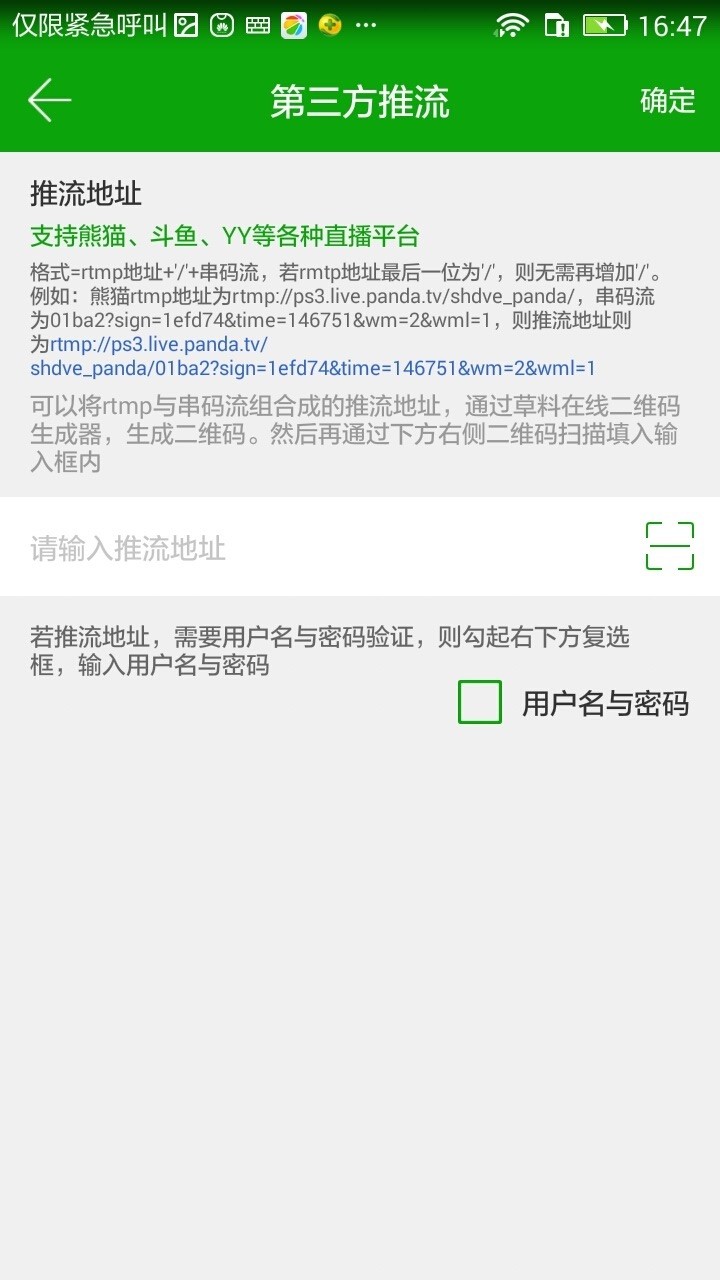 3、直播推流:用户自行填入推流地址后(比如熊猫,斗鱼等知名直播空间);
