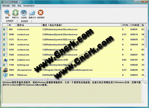 秋秋任务管理器让您方便的查看现在您的电脑上有哪些程序在运行,并且列出了每个程序所在的路径,CPU、内存占用,命令行等参数,也可以在这里关闭任何程序,方便的右键菜单,操作简便。最重要的是:对每个程序的性质都作出了详细的解释,提示可能存在的病毒、木马,还可以自动到我们的网站上去查找关于这些程序的最新说明,常见的绝大多数程序都能查得到,而且以后出现的新软件或者新病毒,只要我们网站上添加了它的说明,您就能立即看到