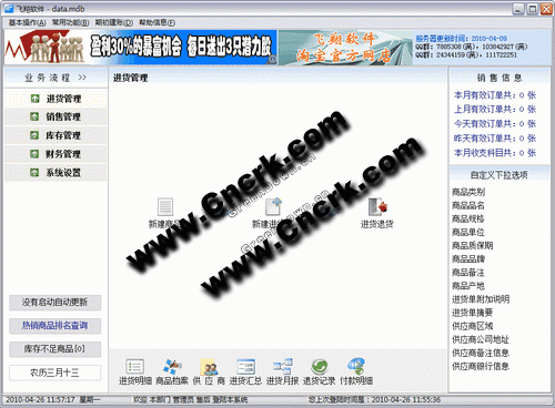 飞翔商铺进销存软件 V5.85 简体中文绿色免费版 《飞翔商铺进销存系统》软件集“财务明细账”和“商品明细账”功能于一体,主要特色:容易上手,免费实用。软件采用“懒人式”操作方式设计,自动做帐,自动生成各种经营管理报表,软件支持条码枪、小票打印机,扫描仪,适用于各种商铺店铺, 如:电脑店、日用品店、百货店、五金店、手机店、电器店、药品店,玉器店等用于商品类零售批发收银管理。