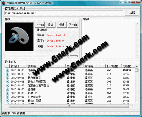 自动获取百度上提供的新歌 加入播放列表,支持播放。播放过的文件右键选择保存歌曲即可。 支持显示歌词(非滚动) 感觉百度新歌提供的歌曲挺好的,但是不能下载。所以才做了这个工具,喜欢的朋友拿去用。不喜欢的飘过