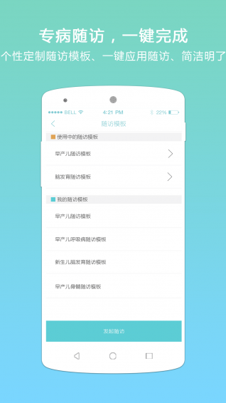 4、专病随访、一键完成:连接随访患者,提升患者满意度,大大缓解医患纠纷。持续收集患者临床数据,为医生科学研究提供案例支持;