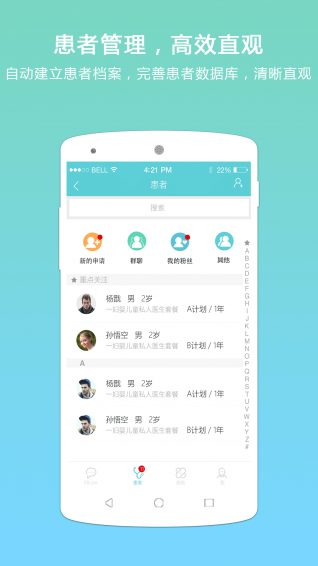 1、连接患者,随时随地:彻底打破时间与空间的限制,实现微信式随时随地互动,基于可信数据的有效沟通,让医患之间交流更充分、更高效;2、患者管理,高效直观:自动建立患者个人档案,完善患者数据库,分组管理,清晰直观;患者资料,一目了然