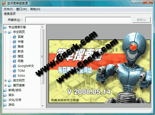 蓝点简单搜索通 V1.0 简体中文绿色免费版 本程序目前收录的搜索引擎有:百度、中搜、雅虎、新浪、搜狐、网易、Google中文、TOM、SoSo、Yahoo、AskJeeves、MSN、 Google、AOL、Altavista、ThunderStone、中国电信黄页、网易黄页等