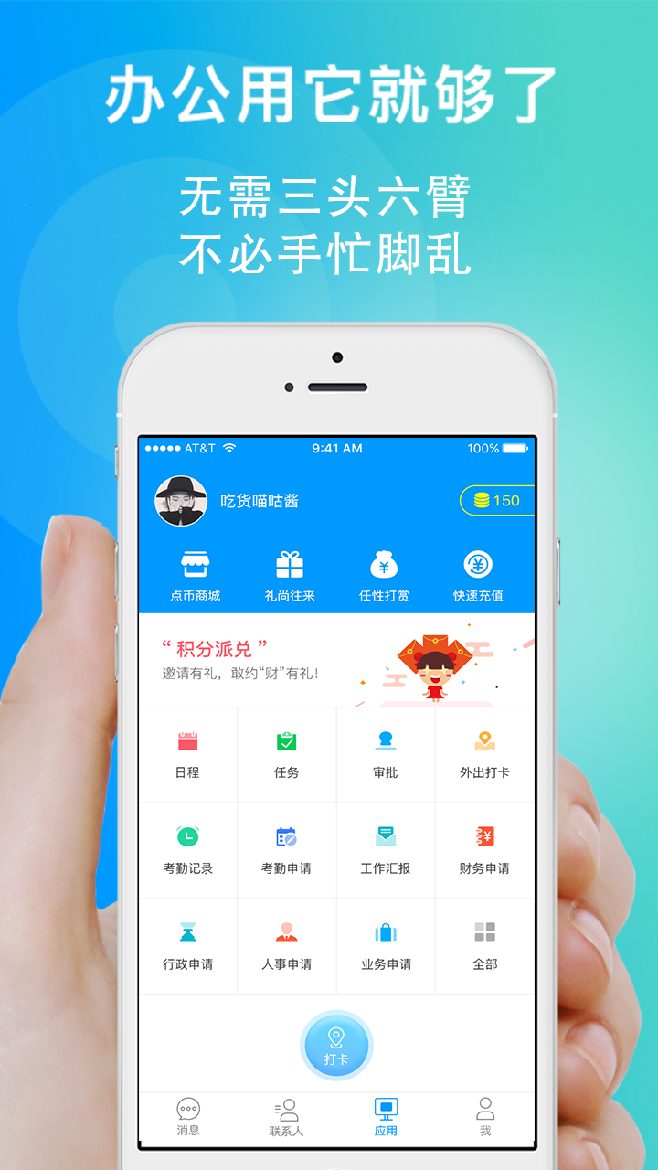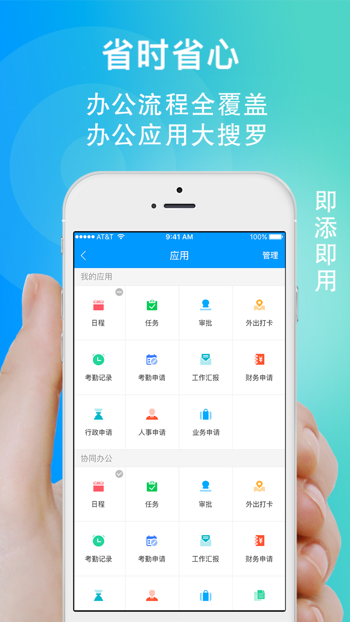 1.申请审批人事、行政、财务、合同、考勤完全无纸化处理,移动申请,移动审批