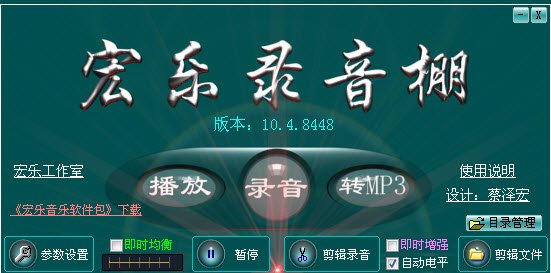宏乐录音棚是一款可以任意调整混响参数的录音软件,可将录音结果由WAV格式转换为MP3,可用于现场录音、任意设置混响参数(添加回音)、可录制或剪辑音频信号;可即时或后期均衡、混响、音色增强;可变速变调、后期混音、转MP3等等。