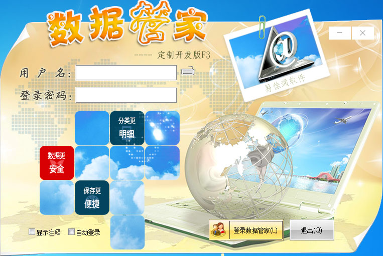 易佳通数据管家是一款功能强大的远程企业文档管理软件,软件方便用户将企业信息或个人数据分类保存,打包到软件中,防止企业或个人信息被外部窃取 。