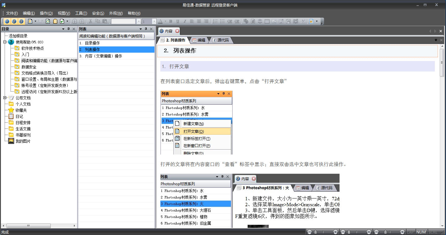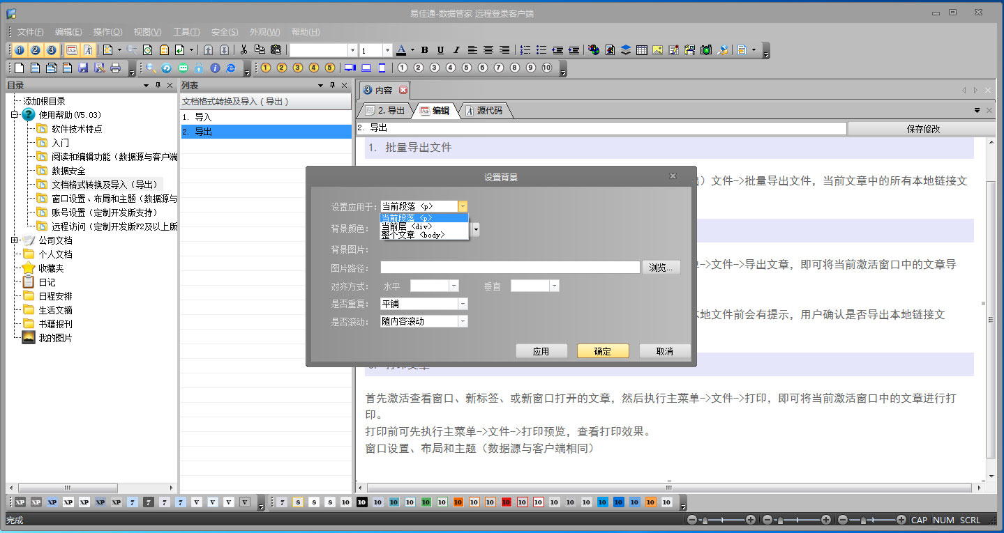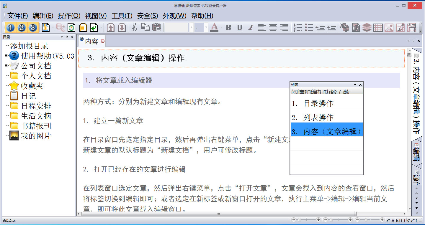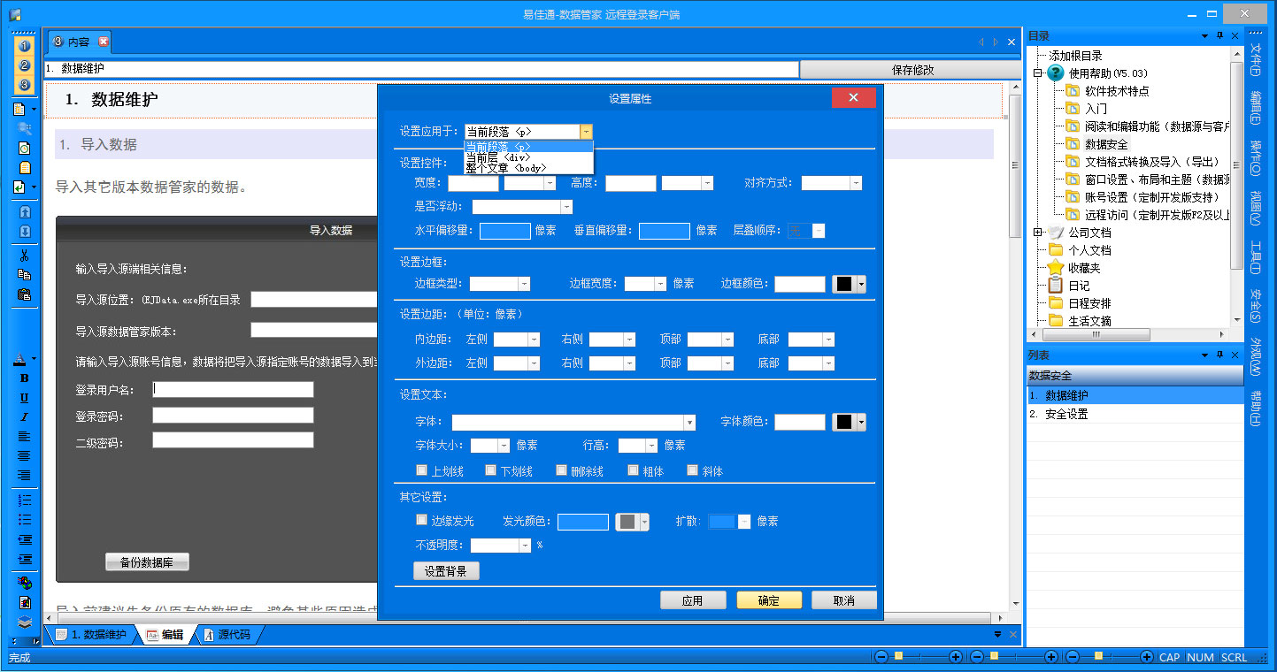 易佳通-数据管家是一款功能强大的远程企业文档管理软件,软件方便用户将企业信息或个人数据分类保存,打包到软件中,防止企业或个人信息被外部窃取。软件具有文档格式转换功能,用户可以直接复制网页、Word、Excel、文本等文档到软件的编辑器中,软件会自动进行格式转换,保留原文档的样式。软件具有文档编辑器,提供丰富的编辑功能,用户可以将文本、图片、文件或语音保存到软件中,保存文档后图片和本地文件会自动加密保存到数据库;用户可在文章任意位置插入文字、表格、层、图片、文件、链接、语音留言等,并可对其样式进行设置。软件可将用户数据分类明细的保存,并提供了丰富的搜索查询功能,用户可以很容易的检索数据信息;用户可将软件中的文章标注或互相链接。软件提供模板支持,用户可将固定的文档编辑格式保存为模板,需要时在编辑器载入即可,避免重复编辑,提高效率。软件提供了丰富的界面布局和主题,用户可以任意设置软件中窗口的布局,字体的大小,并可以保存用户自定义布局;软件提供了多种界面主题,用户可对软件的颜色和外观做出多种选择;软件的工具栏可以自定义,用户可以根据使用习惯任意增加或删除工具栏。