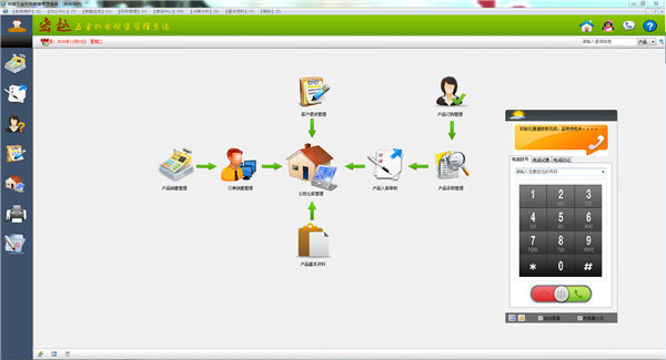 销售管理:产品销售管理、订单销售管理、电话自动弹屏销售管理、客户退货管理、客户订购管理、产品采购管理、产品入库审核、公司仓库管理。财务管理:现金收支管理、收支审核管理、现金银行管理、公司账户管理、公司业务转账、资金调拨管理、公司借支管理。