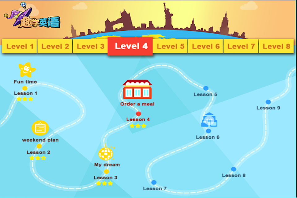 螺旋式上升课程体系?8个级别,进阶式的课程体系,由简到难,螺旋式构建语言知识体系。?单词、句型由浅入深、语言中学习语法,听、说、学、练、用,多个环节巩固知识;