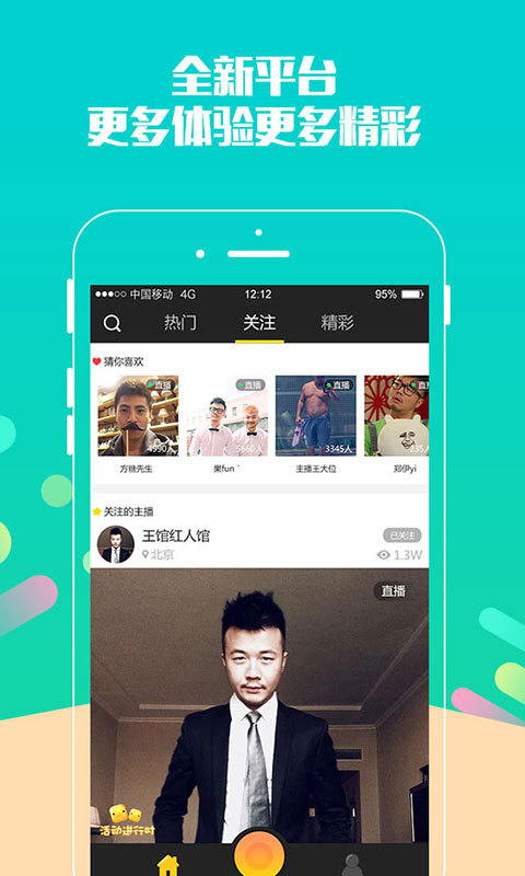 1、直播:来这里跟男神互动,看肌肉猛男如何show、尝尝小鲜肉有多鲜、跟萌大叔聊聊怎样萌。与你爱的天菜一起播!2、关注:你喜欢的主播都在这里,看直播,看回放,都能搞定!