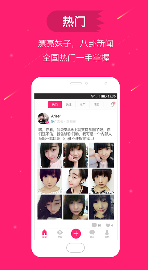 1、漂亮妹子、八卦新闻、全国热门,一手掌握;2、新闻通知、活动聚会,看看告示全知道;