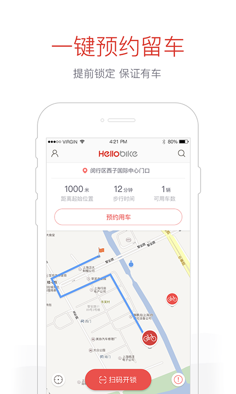 关于Hellobike: Hellobike是一款轻活自由的绿色出行共享单车。曾经,科技的进步让世界更近,然而今天的我们,梦想仍 会堵在上班的路上,幸福挤在狭小的车厢。HelloBike的出现,让你和这一切say goodbye!手机扫码,轻松 出发,告别车桩,自由还车!每天,用一抹红和这个城市问好!HelloBike,HELLO,CITY!