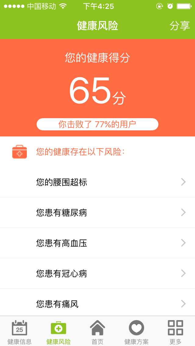 健康风险:通过对采集数据进行分析,专家会反馈用户存在的健康风险与得分;