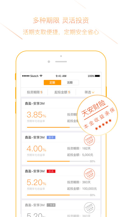 2、定期理财:5.8~7.3%预期年化收益率,鑫盈-安享、安心系列,鑫聚-天利、天秤系列产品由天安财险提供履约保证保险