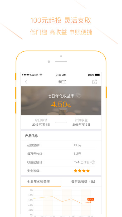 1、活期产品:+薪宝:4.5%七日年化收益率,100元起投,灵活支取,T+1日收益起始计息/赎回到账,收益是银行活期存款12-15倍