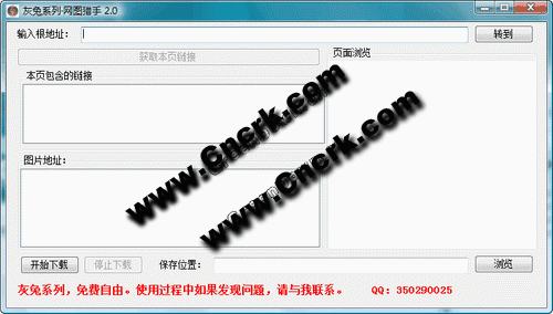 灰兔系列网图猎手 V2.0 简体中文绿色免费版 网图猎手原先的版本是全自动式地把网页上的图片下载到硬盘中,但在测试中我发现会出现死循环现象,因为网页链接较多的时候,就会无休止地下载。考虑到这点,我重写了这个程序,采用半自动式下载。本程序的主要作用是自动把网页中的图片保存下来,而不需要手动地去一张一张地找,然后一张一张地“另存为”,多麻烦!