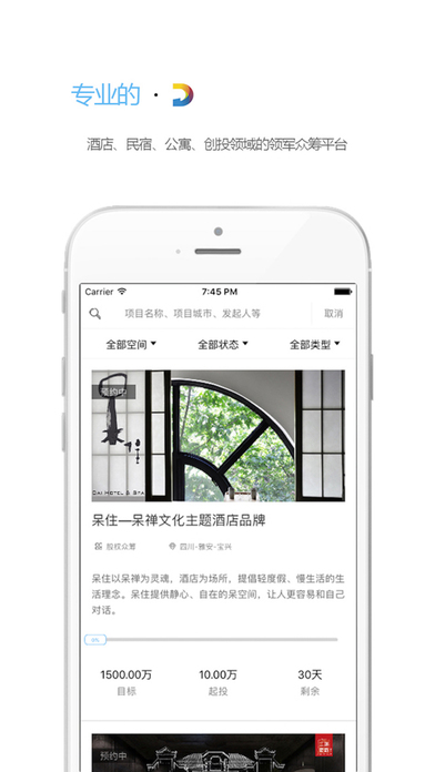 民宿客栈,健身工作室和其它空间。从居家到工作,再到休闲度假,多彩投为有情怀、爱自由的人众筹新型生活空间。