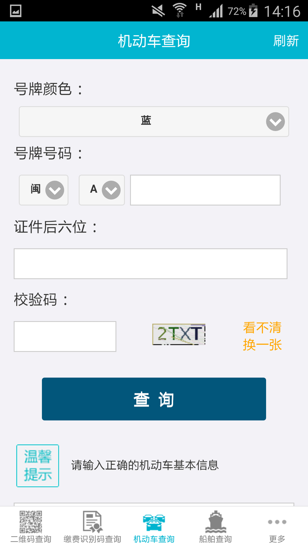 3、机动车信息查询:根据福建省交通执法机构出具的处罚决定书编辑号牌颜色、号牌号码以及证件后六位,并编辑校验码,点击【查询】,显示违法列表界面。