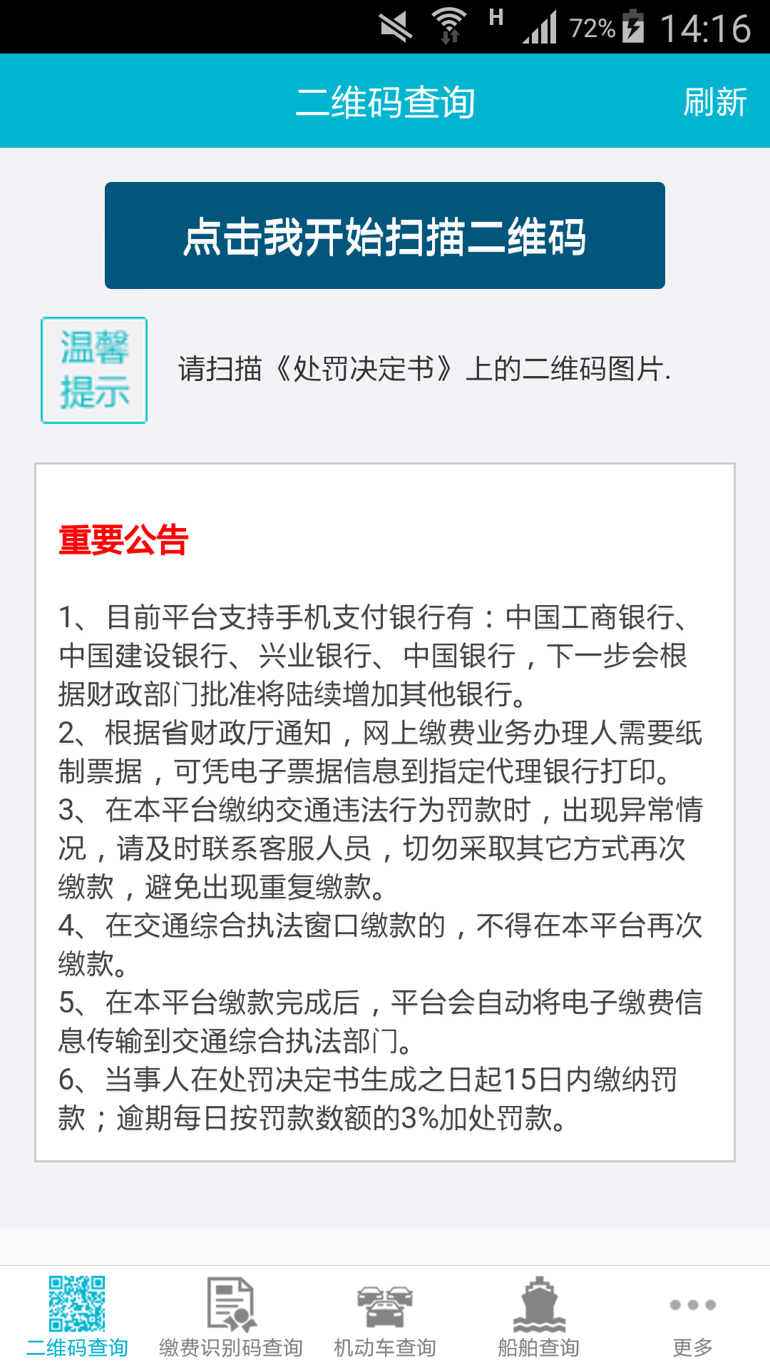 1、二维码查询:点击【点击我开始扫描二维码】,跳转到二维码扫描窗口,对准福建省交通执法机构出具的处罚决定书右上角二维码进行扫描,扫描成功后,显示违法列表界面。2、缴费识别码查询:根据福建省交通执法机构出具的处罚决定书编辑缴费识别码,并编辑校验码,点击【查询】,显示违法列表界面。