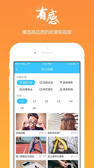 趣味口语视频,多种场景主题练习供你选择通过精选欧美高品质短视频,并设定不同难度等级和兴趣主题,适合最广泛的口语练习场景,让你看大片get口语技能,迅速培养英语思维。