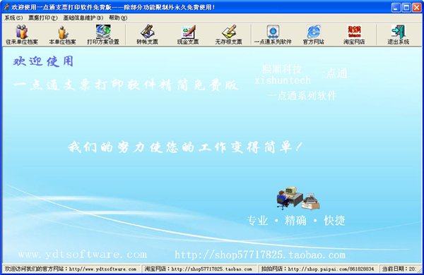 1、完全 一点通支票打印软件支持所有银行的现金支票、转帐支票、无存根支票,对打印机没有任何特殊要求,广泛适应Windows主流系列版本和激光、喷墨、票据专用和普通针式等打印机。人性化的功能设计、直观的软件界面,完全模拟手工操作方式,广泛适应各种电脑应用水平的客户。