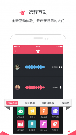 通过蓝牙功能,将APP与智能玩具链接,实现远程控制,用户可根据语音、音乐、模式选择自嗨和互嗨。