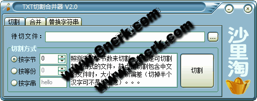 本工具可以将TXT文本文件切割或者合并。切割方式有三种:按大小(有缺陷,只能按近似值切割)、按份数、按标记(比较适合电子书,不过用户要预先在文件设置标记);合并方式很简单,只是将文件放在尾部相加。以后将会更加完善的