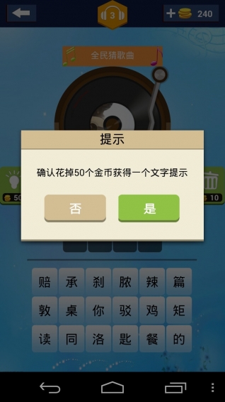 全民猜歌曲:有没有那么一首歌,会让你轻轻跟着和?有没有那么一首歌,会让你轻轻想起我?当熟悉的旋律再次响起的时候,你心中是否也会荡起层层涟漪?《全民猜歌曲》让你回忆老歌,聆听新歌,在歌曲的旋律中陶醉。《全民猜歌曲》精选几百首经典老歌,精品新歌,每段歌曲15秒钟,请你在听完后选择正确的歌曲名称即可过关。《全民猜歌曲》准备好了,你的耳朵准备好了吗?让我们全民猜歌曲,一起疯狂吧!