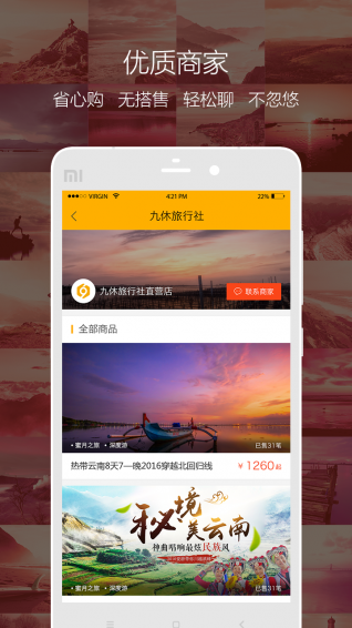 九休旅行是国内目的地旅游众享产品,致力于为游客提供目的地吃、住、行、游、购、娱、周边游、自由行、达人为一体的综合性服务。我们专注于云南,深耕云南,挖掘本土优势资源,满足您多样的旅行需求;玩转云南,一站搞定;九休旅行,同步当地生活体验。我们把吃住行游购娱、周边游、自由行+达人九大旅游要素全聚合;线上旅游服务模式全面升级,九休旅行,让您享受无忧的云南时光;我们提供多元化产品组合的电商模式,去中间商、去差价,优价的商品,超赞的美食,深度的体验,九休旅行,带您超值玩云南;集结各类旅行爱好者,当地达人与旅行者捎上你,推荐行程、创意休闲路线、不收费攻略、专享定制旅游行程,九休旅行,给您深度的旅游体验。