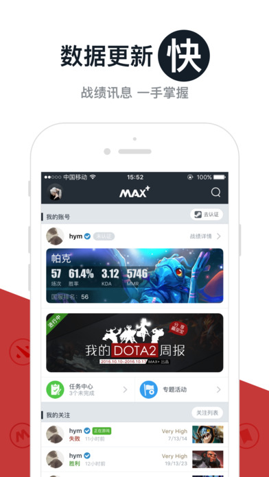Max+ 为Dota2/守望先锋/CSGO/英雄联盟 LOL 等电子竞技玩家提供最专业的数据统计、职业赛事、新闻资讯、直播视频等一站式服务.后续将支持更多的游戏.打造最好玩的电子竞技游戏社区。【软件特点】