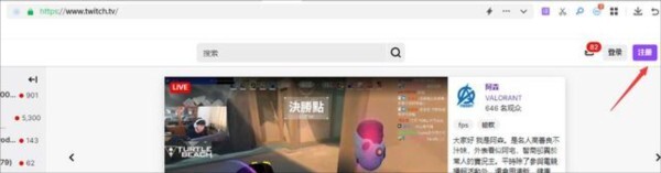 1. 开启Twitch,轻点右上角的【注册】按键。若账号尚未登录,该按钮呈现紫色;登录账号后,按钮则显示为黄色。