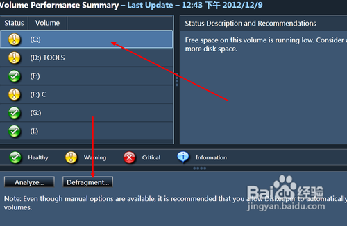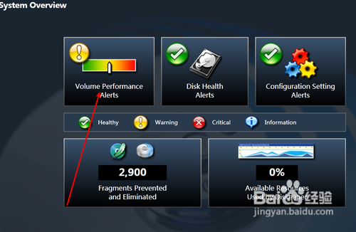 3.然后在主界面中,有一系列的磁盘选项,我们需要用的是拖动进行磁盘整理,就点击第一个选项,即volume performance alerts 如图所示。