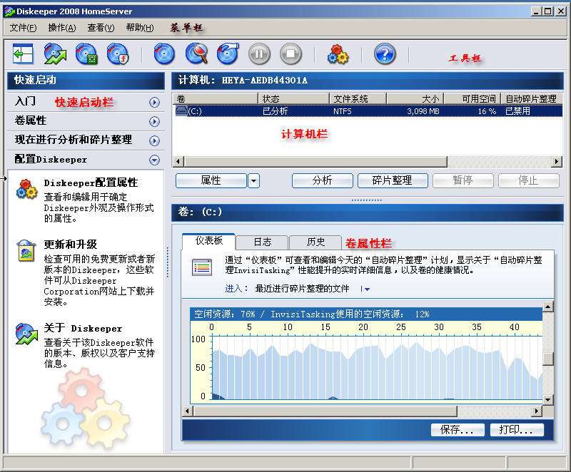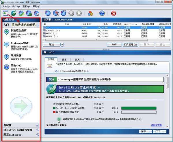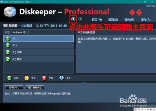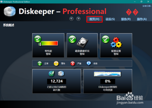 由于 Diskeeper 在系统启动后便自动在后台运行,所以通常无须我们人工干预。不过,若想了解 Diskeeper 的运行情况,我们可以启动 Diskeeper 后,点击导航栏上的“首页”,打开 Diskeeper 的主界面进行查看。