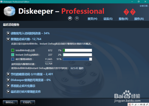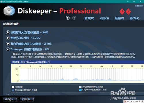 点击第二行的“Diskeeper 使用的可用资源”,则可以查看最近的活动报告。