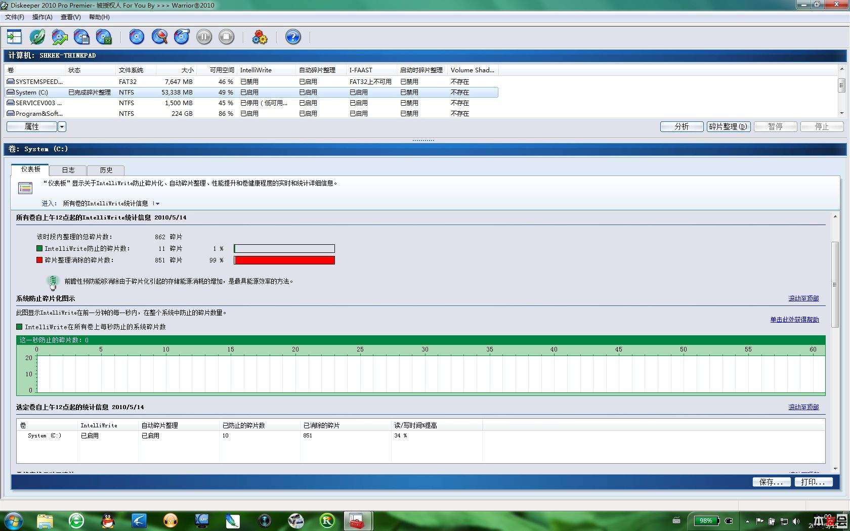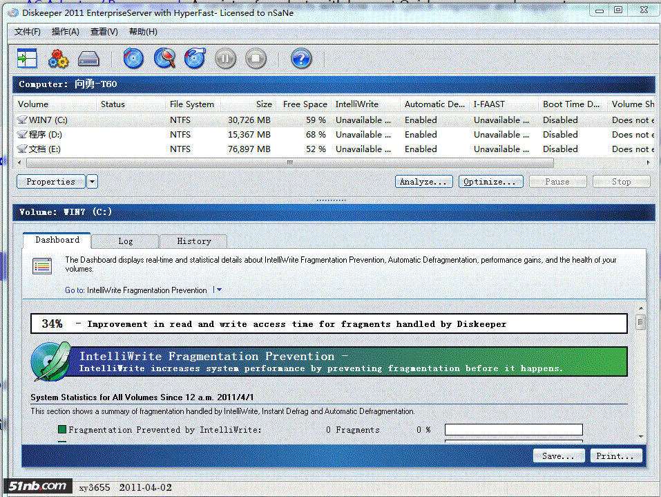 随后,点击第二行的“已防止和已消除的碎片数”,则可以看到 Diskeeper 完成的工作和具体的性能提升数据。