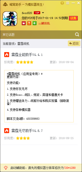 雷霆战机手游电脑版辅助工具最新版支持好友无尽、Boss、战队、炼狱、英雄和普通关卡,自动赠送体力、战前补给和购买祝福等,后续还会开放更多实用性的挂机功能。