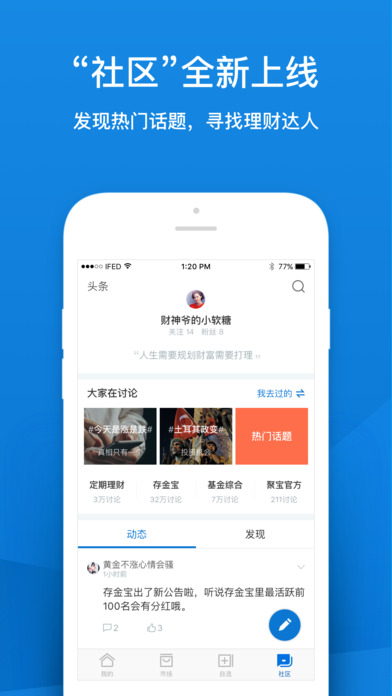 · “动态”与“发现”:更快发现热门投资理财话题、精彩财经内容和投资理财达人。