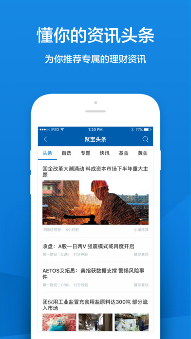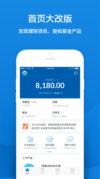 蚂蚁聚宝-与支付宝同属蚂蚁金服旗下,智慧理财平台。只需一个支付宝账号,余额宝、定期理财、基金理财、黄金投资……各种投资理财轻松搞定,收益资产一目了解。【软件特点】
