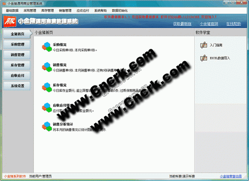 小金猪通用进销存系统 V1.1 简体中文官方安装版 市面上第一套功能齐全,使用简单,真正免费的进销存管理软件。可广泛应用于商业贸易、零售批发行业(中小型企业和个体经销商)。如食品饮料、电脑及配件、通讯类产品、汽车及配件、摩托车及配件、机电化工、五金交电、日用百货、建筑材料、家俱、装饰材料、化妆品、纺织配件、医药及医疗器械、超市收银等