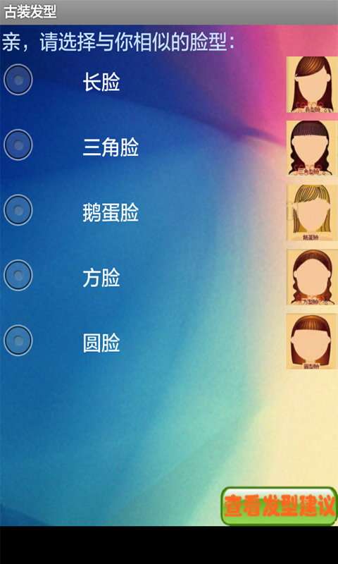 免费的古装发型设计,帮你找到最适合的古装发型!先选择与你相似的脸型,无论你是长脸、三角脸、鹅蛋脸、方脸、圆脸都可以在这找到适合你的古装发型。
