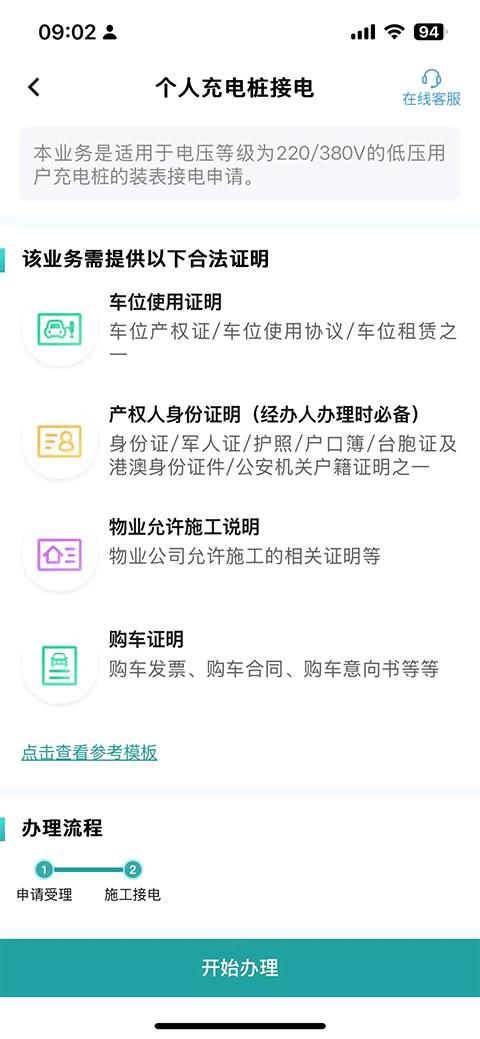4、办理该业务,需提供车位使用证明、产权身份证明、物业允许施工说明、购车证明等合法证明。确认证明已准备齐全后,点击下方“开始办理”按钮即可。