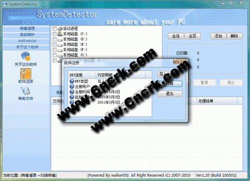 SystemDetector V1.2 简体中文绿色特别版 SystemDetector主要用于辅助配合专业杀毒软件工作,方便于用户快速清理已知病毒和分析出当前系统中所隐藏的未知病毒,并提供强大的手动解毒功能方便用户在杀毒软件暂时无法清理或者清理不彻底的情况下将病毒清理彻底,并可修复被病毒所更改过的系统设置。其强大的系统日志检查功能可以为用户生成一份详细的日志报告,以便于其他朋友可以根据此日志报告给出合适的问题解决方案