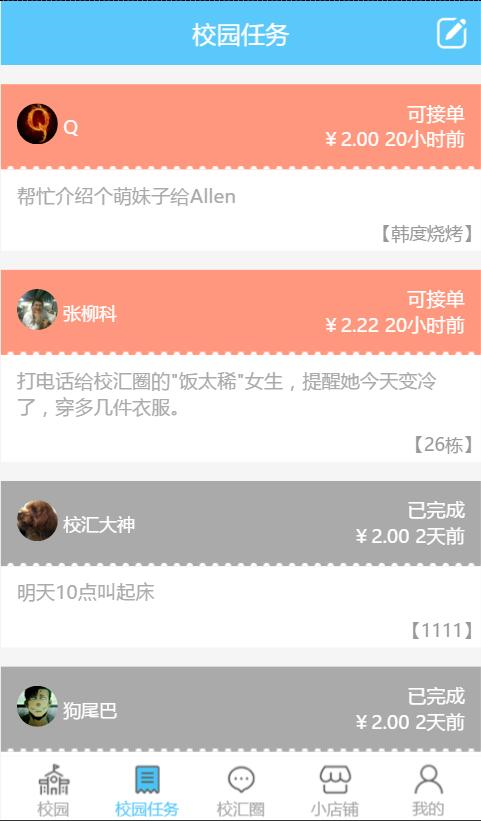 3.小店铺:学生自主创业小店、校内校外商家可入驻,买家可根据需要自助下单,卖家发布任务送货上门。